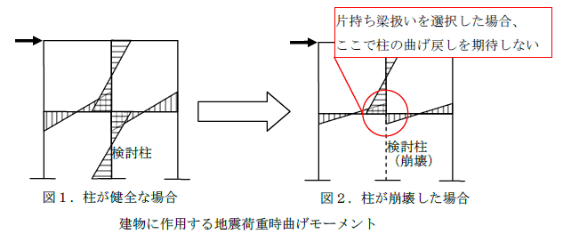 検討時に梁に接続している柱が軸崩壊していた場合に崩壊した柱による梁の曲げ戻しが期待できない場合があるという考え方よりきています。
