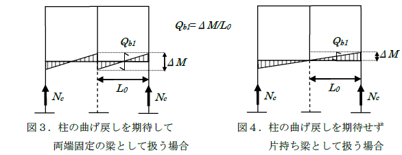 片持ち梁扱いとし柱の曲げ戻しを期待しないで梁の片方の端部のモーメントをゼロとして扱う図4の場合のQb1の方が